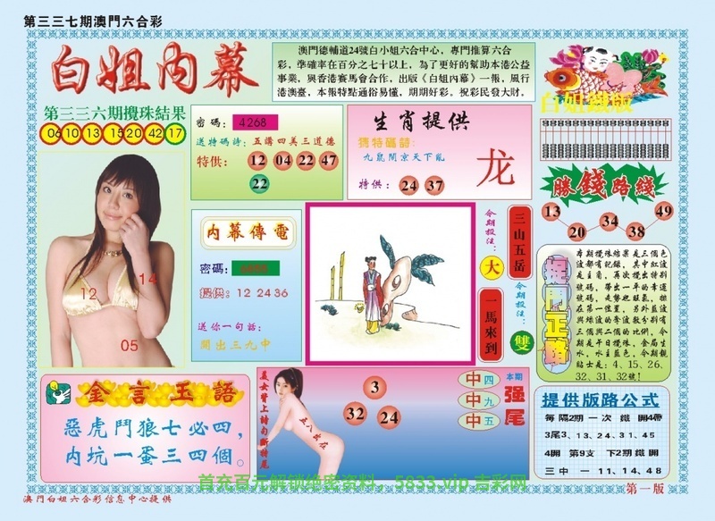 | 337期《白姐九肖》 综合九肖♘:蛇马羊鸡兔牛狗鼠猴 综合七肖♘:蛇马羊鸡兔牛狗 综合五肖♘:蛇马羊鸡兔 主攻特码♘:13.49.24.36.35.47.09.21.03.27 ![]() |